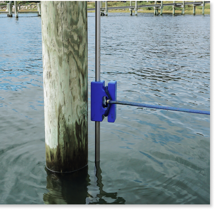 Tide-Adjusting Fender/Cleat System moves up and down with the tide so the fender is always at the height of your boat’s rub rail!